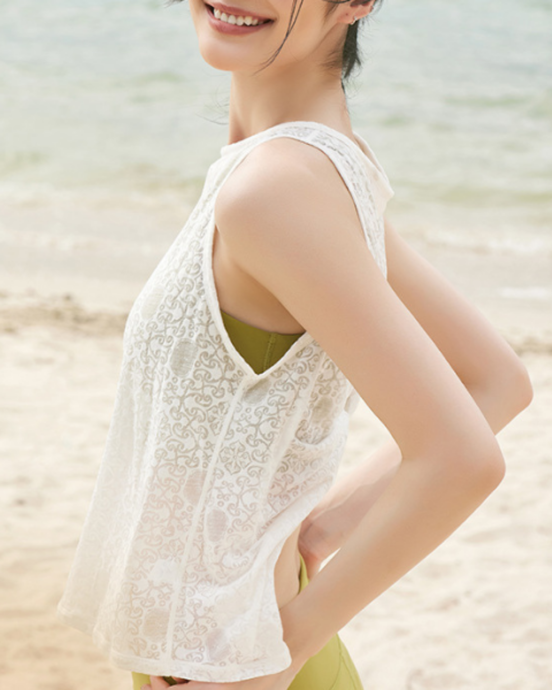 背面にツイストデザインを施したボタニカル柄のタンクトップ。適度な厚みで体のラインを整え、伸縮性があるため肩まわりも自然に動かせます。程よい丈で腰まわりをすっきり見せ、ブラトップとのレイヤードにも最適です。