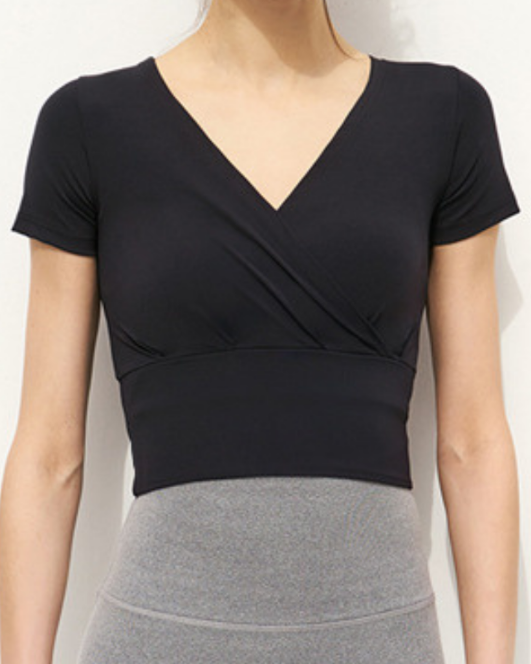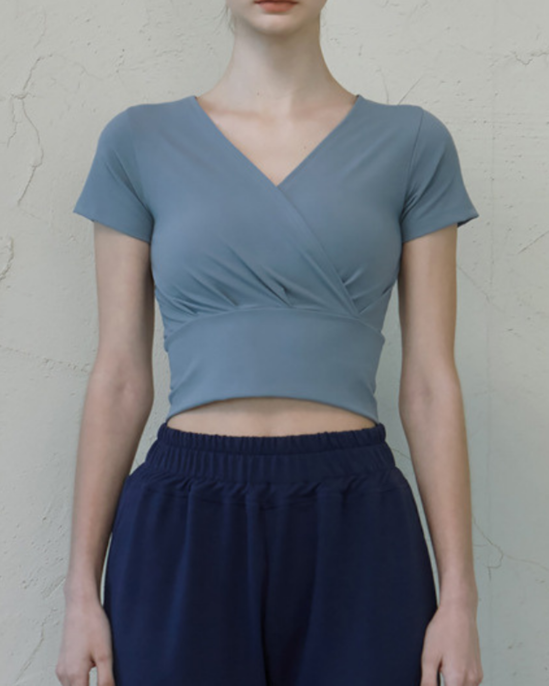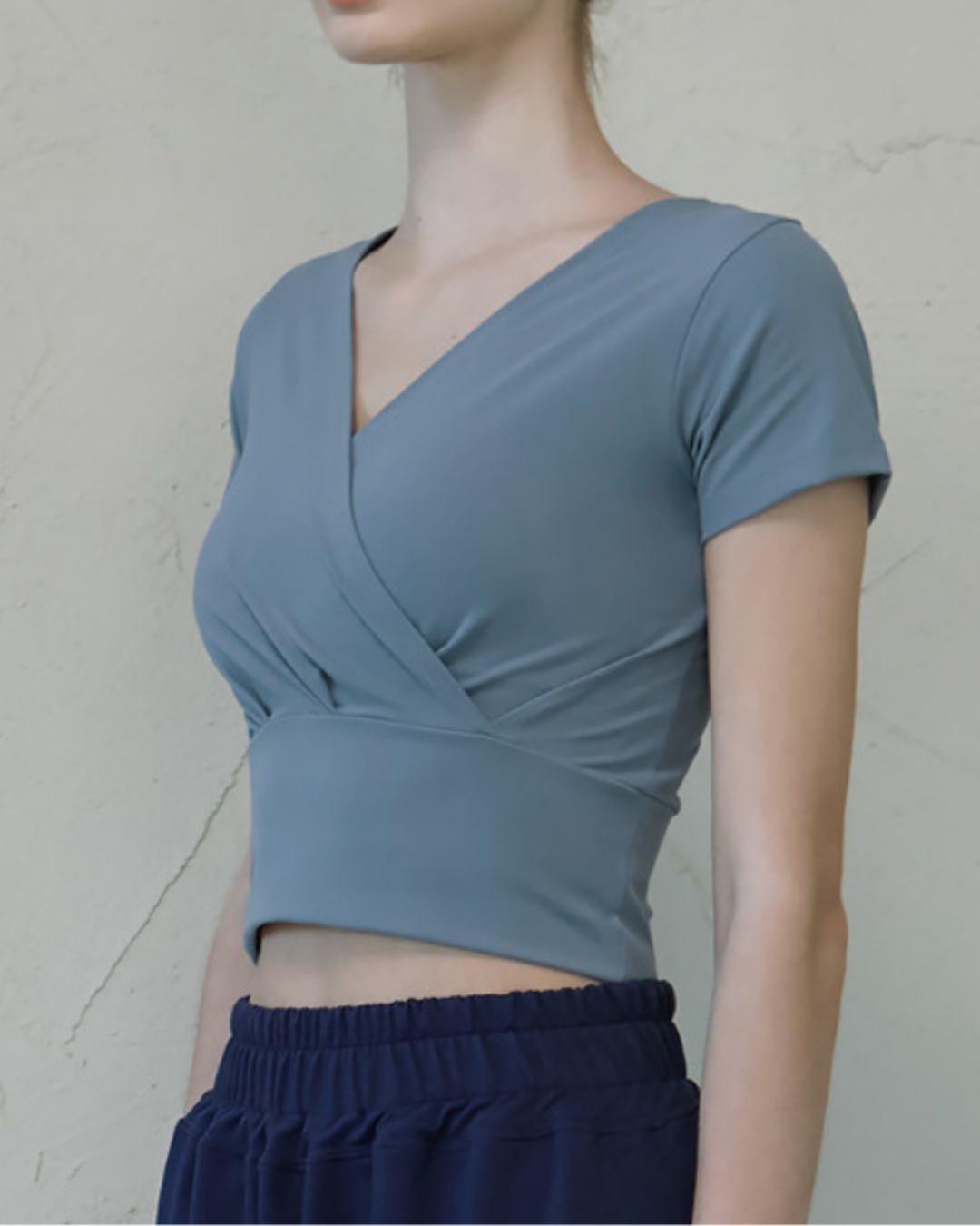 フロントクロスが特徴的なトップス。肩まわりにゆとりがあり、大きな動きや深い呼吸もストレスなくこなせる設計。背面は体に沿い動きにフィット。重ね着してもすっきり見え、集中した動きを支えます。