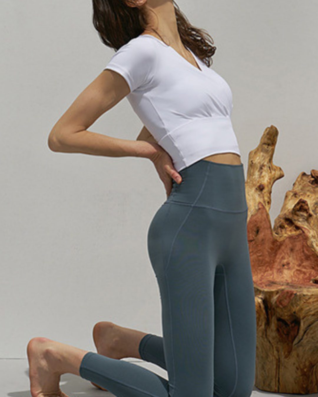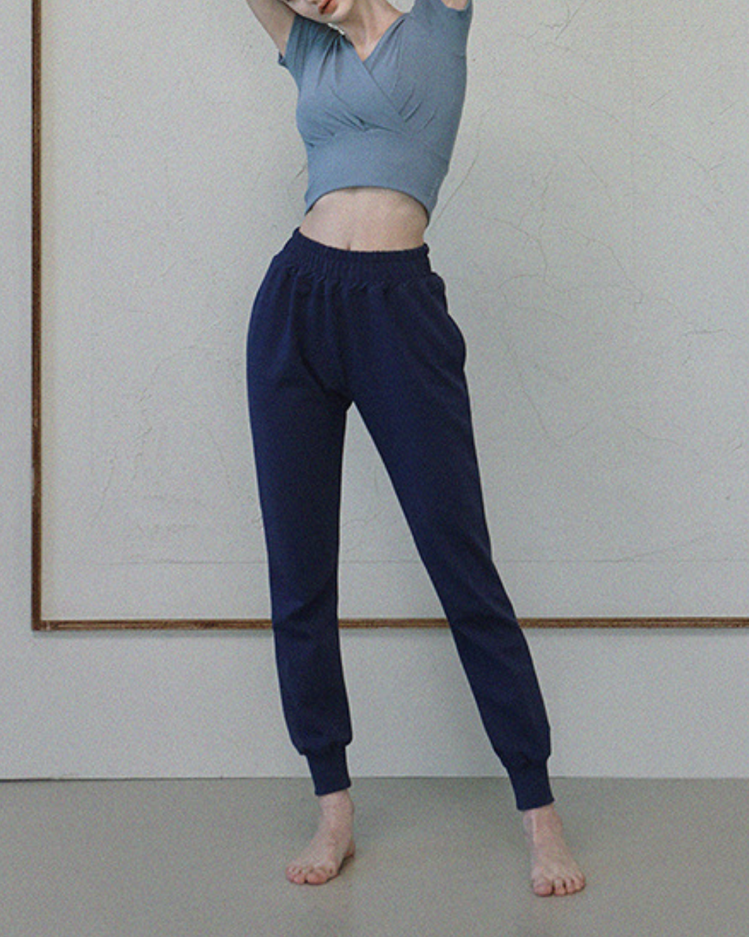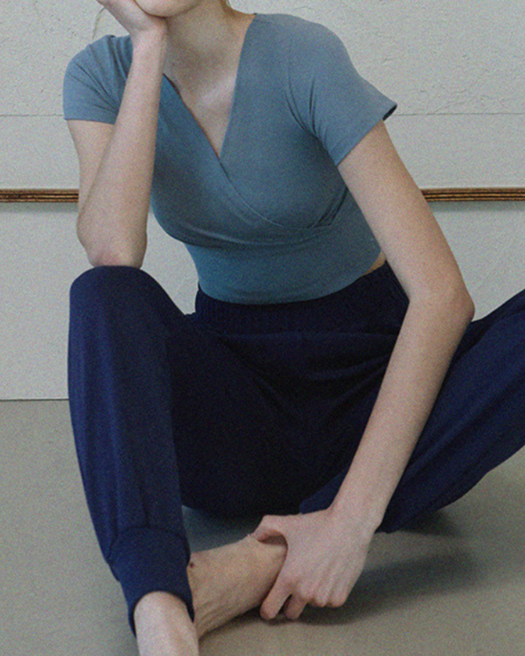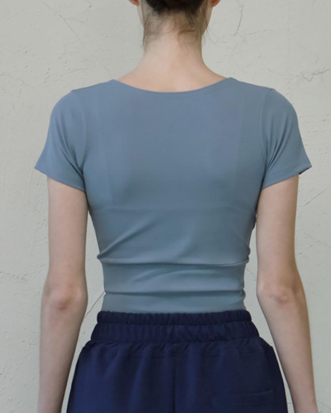 フロントクロスが特徴的なトップス。肩まわりにゆとりがあり、大きな動きや深い呼吸もストレスなくこなせる設計。背面は体に沿い動きにフィット。重ね着してもすっきり見え、集中した動きを支えます。