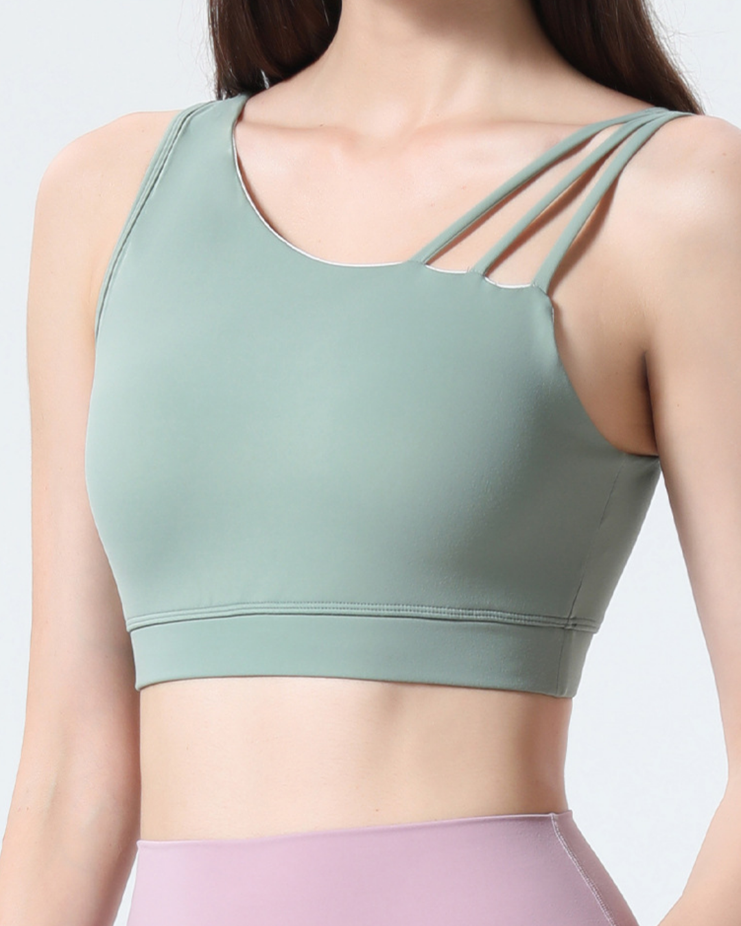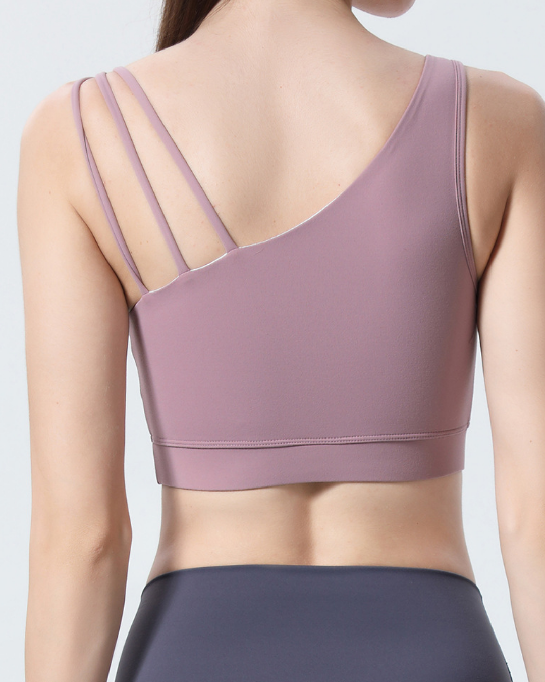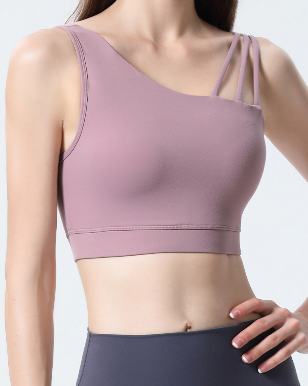 アシンメトリーストラップが印象的なブラトップ。伸縮性のある素材が身体に沿い、動きに合わせて自然にフィット。裾ゴムが安定感を高め、軽やかな着用感です。