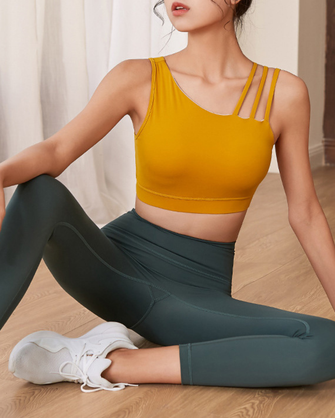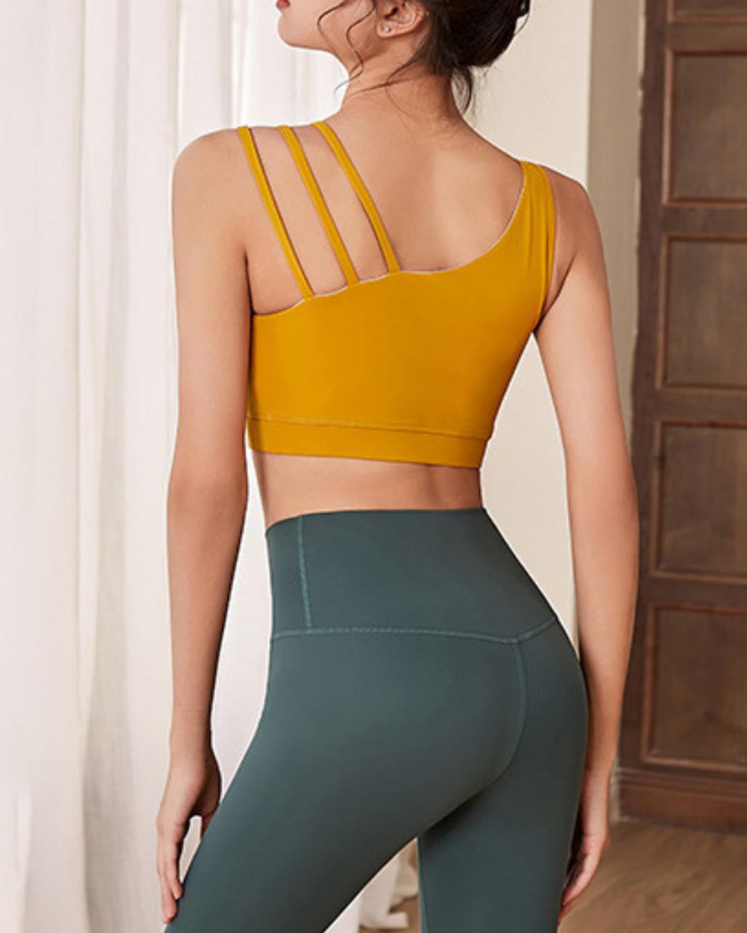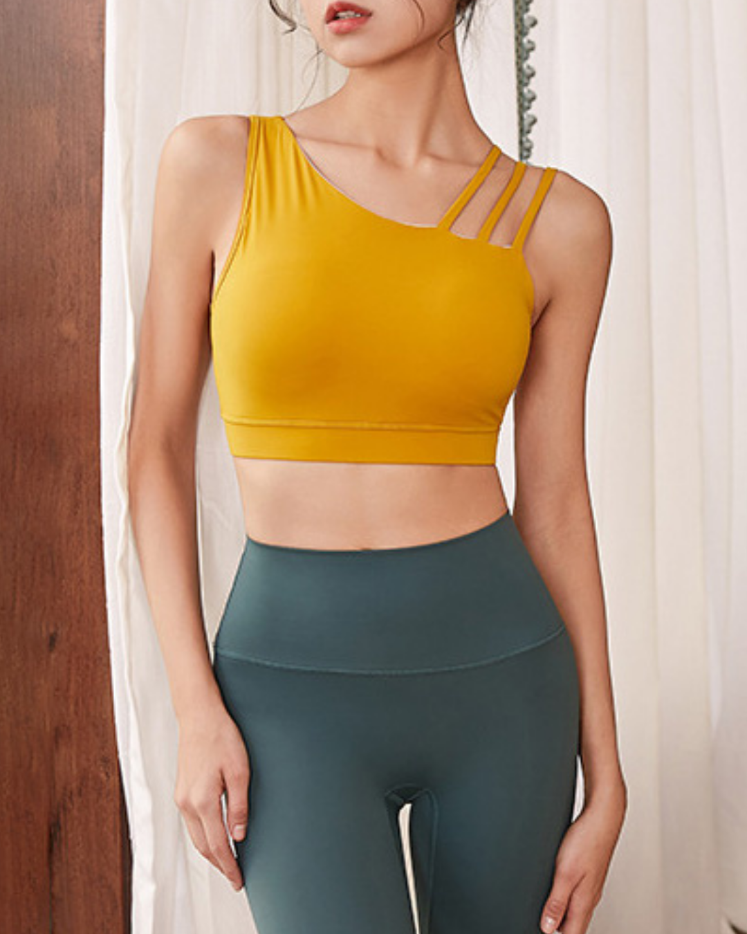 アシンメトリーストラップが印象的なブラトップ。伸縮性のある素材が身体に沿い、動きに合わせて自然にフィット。裾ゴムが安定感を高め、軽やかな着用感です。