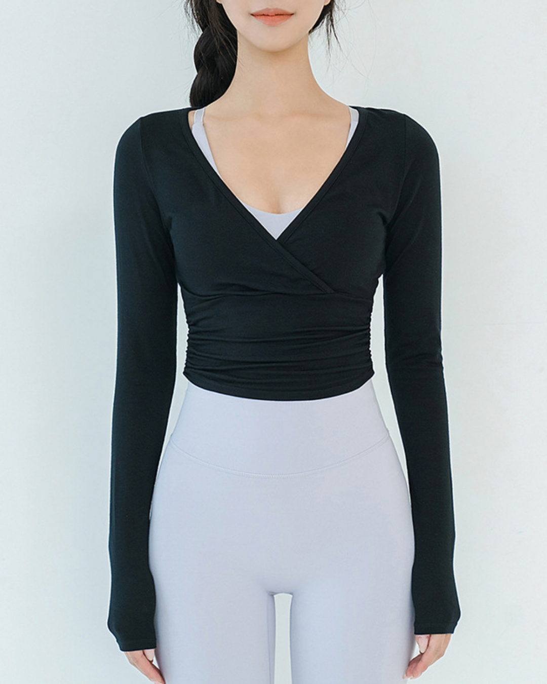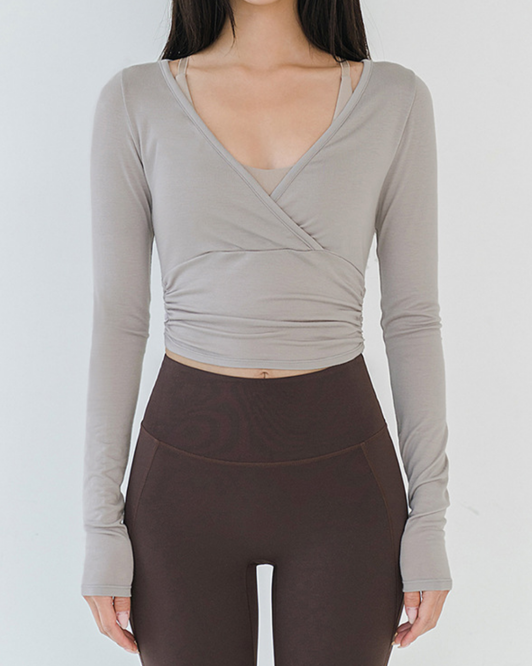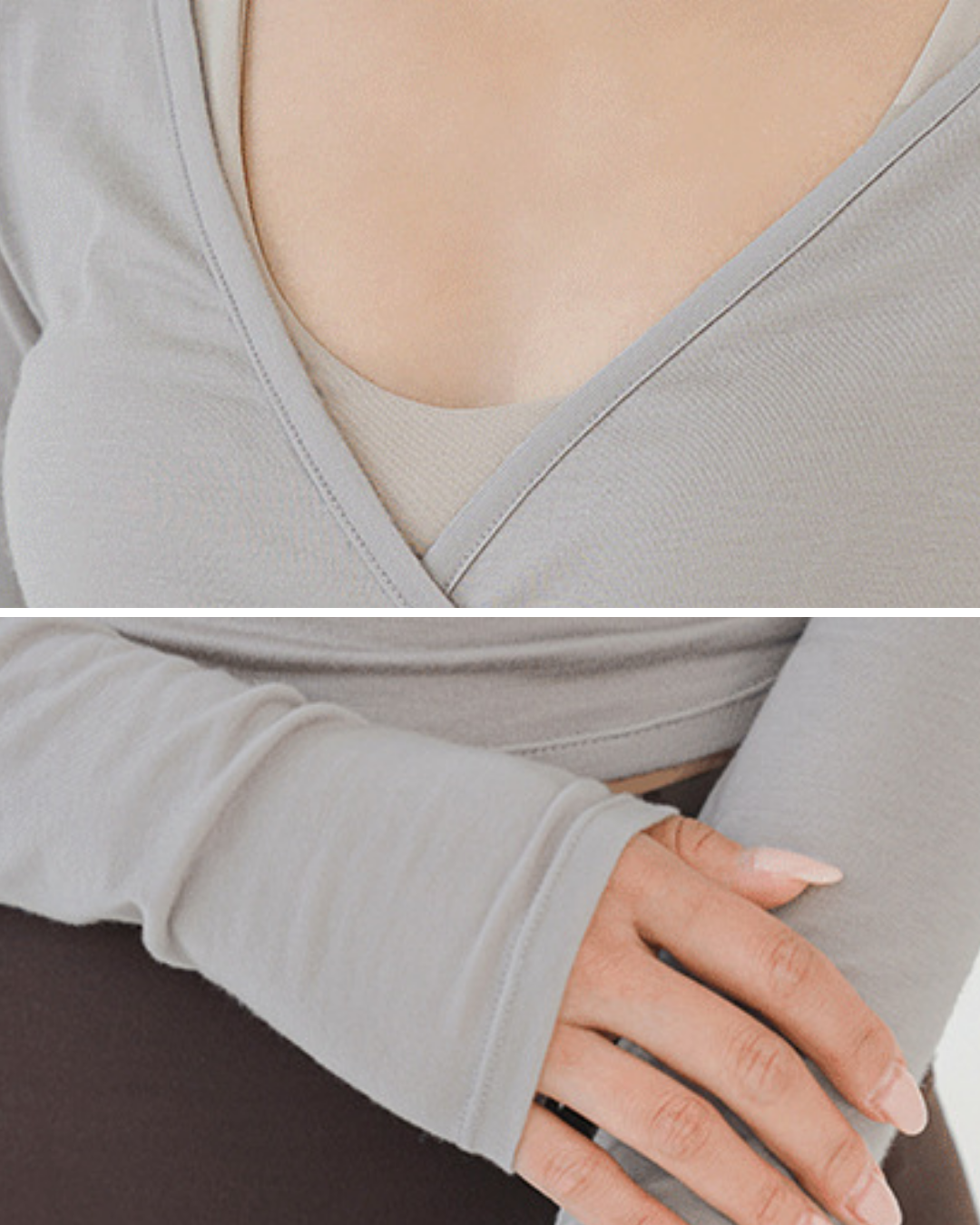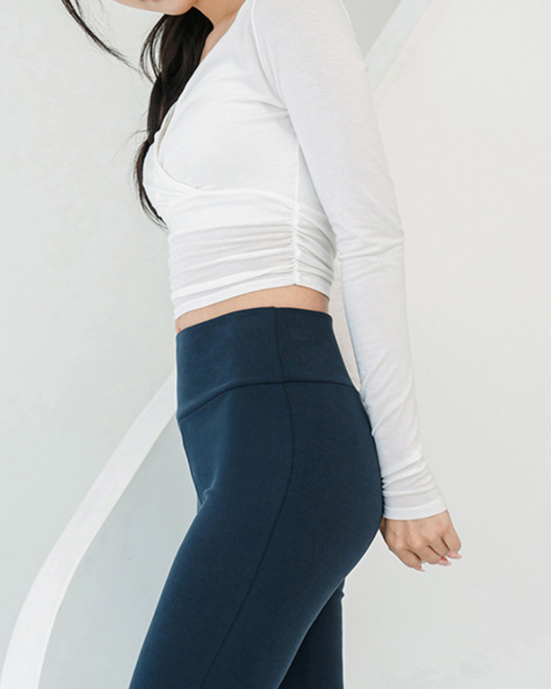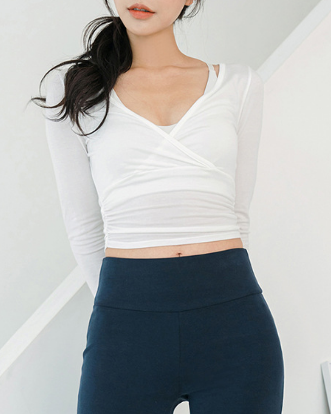 サイドギャザーとカシュクールデザインが印象的なトップス。胸元に自然な立体感を生み、身体のラインを整えます。伸縮性のある生地が動きに沿ってやさしくフィット。腕を上げる動作でも安定した着心地です。