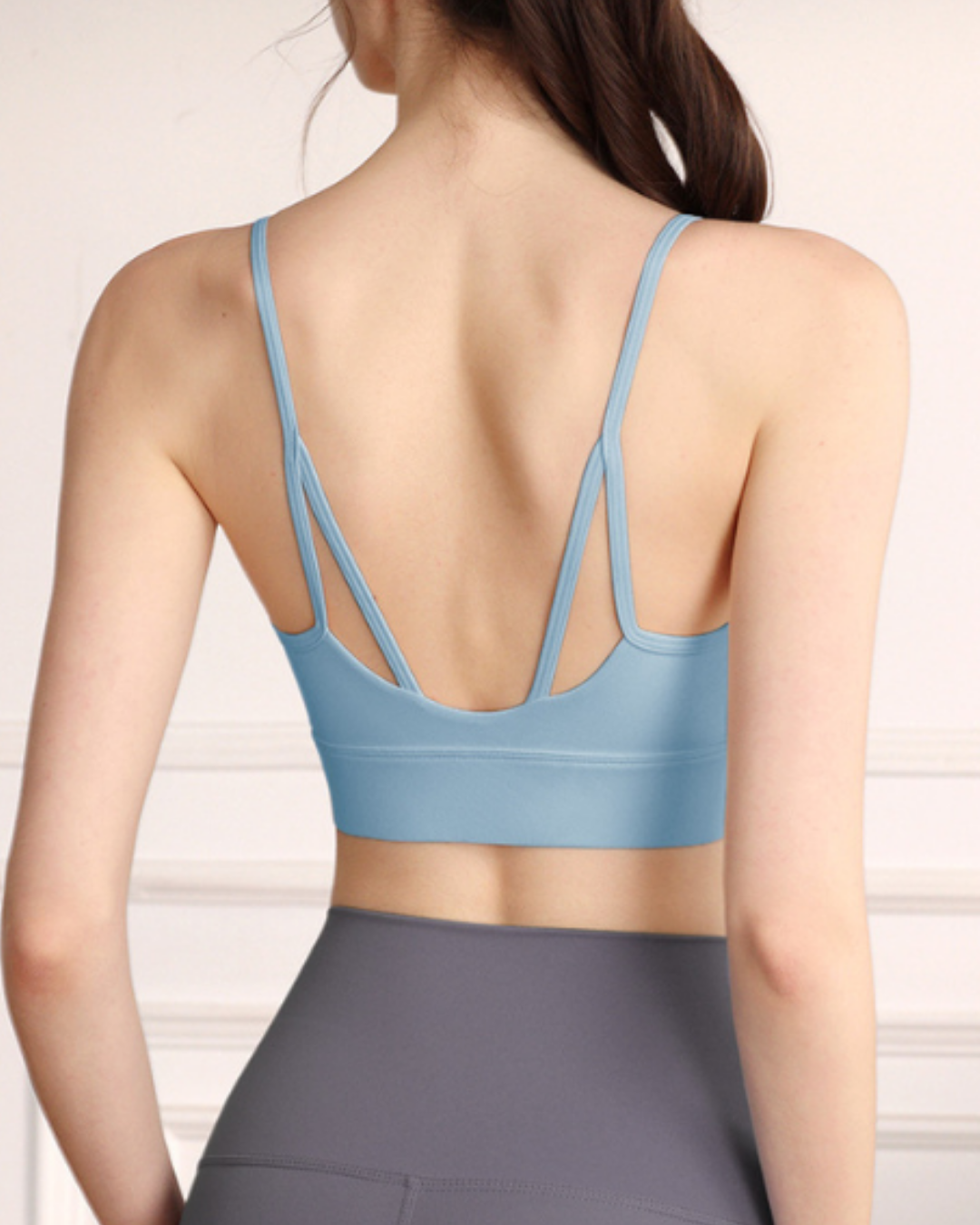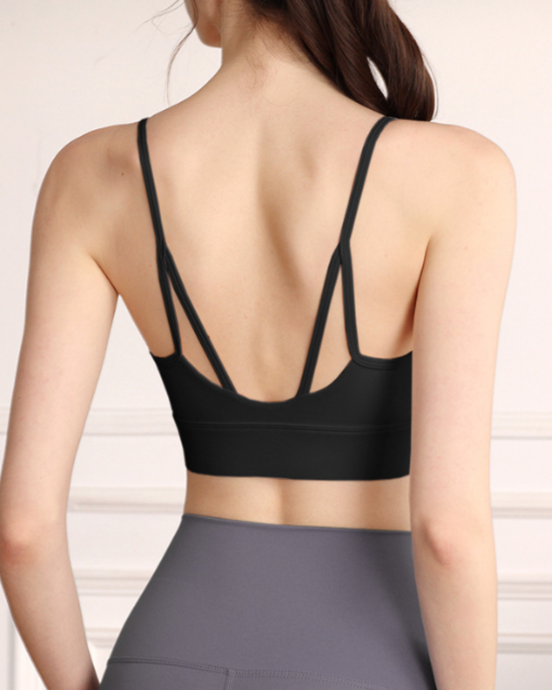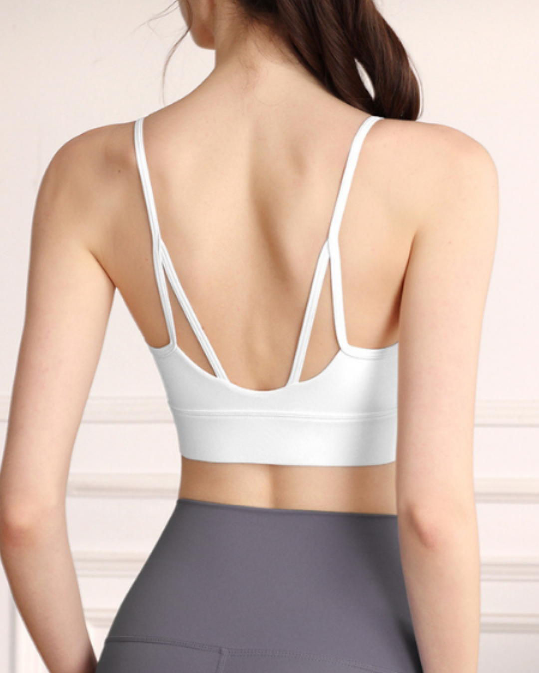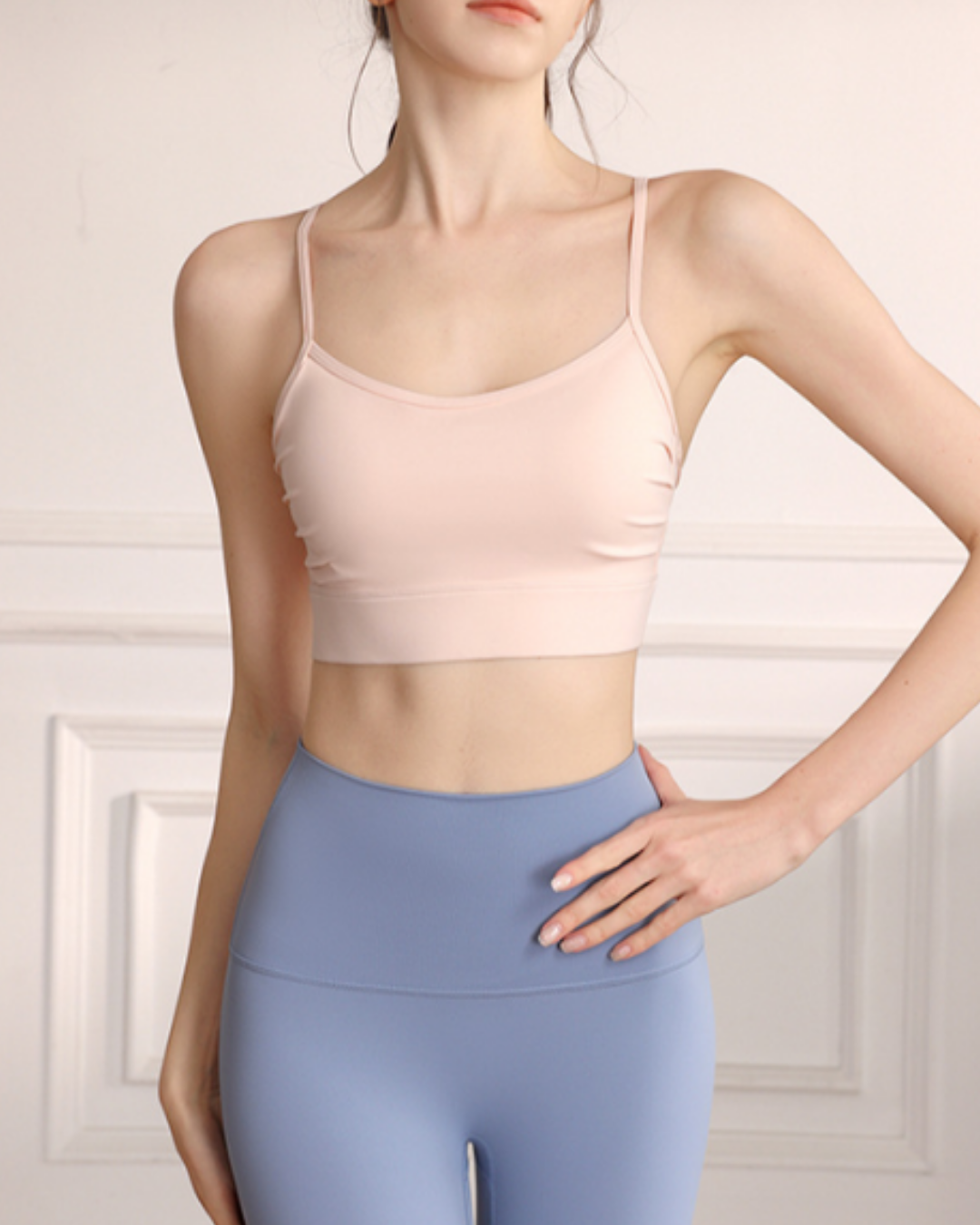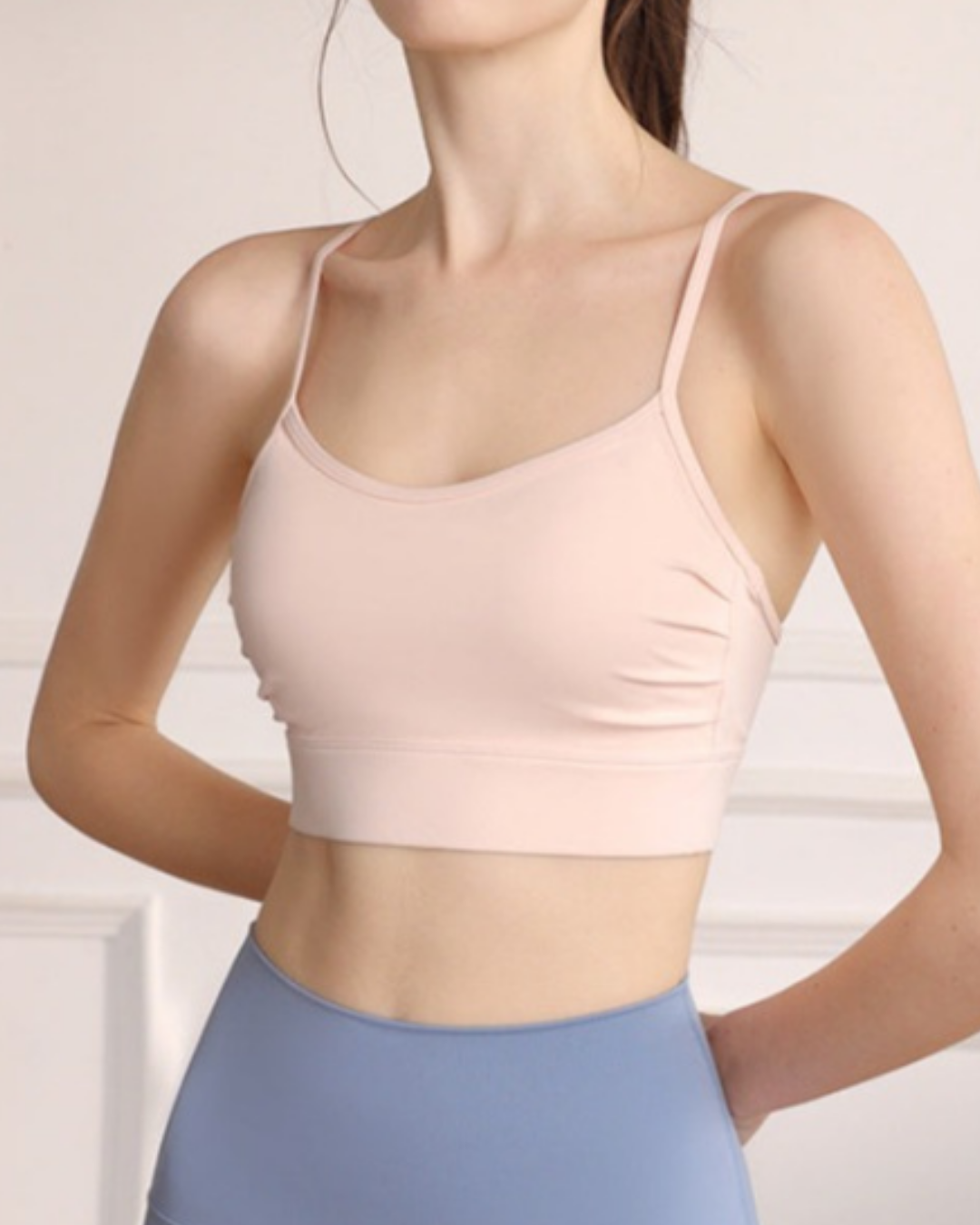 首元のカーブラインがきれいなブラトップ。ショルダーストラップが肩まわりを安定させ、動きに沿ってフィット。サイドプリーツが立体感を生み、身体のラインを整えます。ブラパッド内蔵でズレにくい一枚です。